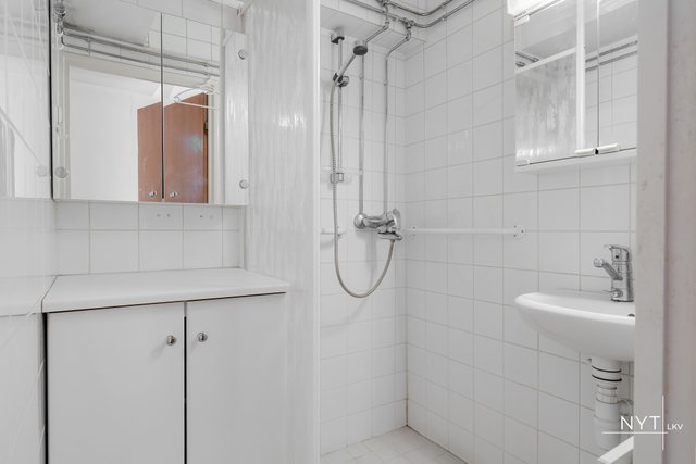 - Suihku, pesuallas, peilikaappi, ja kaapisto