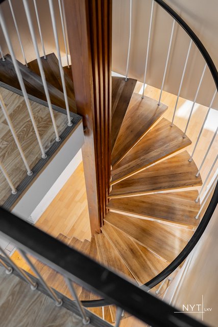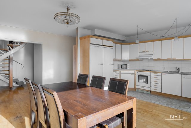 Korkealla kahdeksannessa ja yhdeksännessä kerroksessa sijaitseva asunto on upouusien ikkunoiden myötä hiljainen vilkkaasta ympäristöstä huolimatta. Asunto tosiaan on kaksitasoinen. Alakerta muodostuu kahdesta makuuhuoneesta, olo-/ruokailuhuoneesta, ja suuresta avokeittiöstä, joka taipuu remontin myötä moneen eri vaihtoehtoon aina suuresta saarekkeesta yksinkertaisempaan kokonaisuuteen. Lisäksi alakerrassa on yksi erillinen vessa ja kylpyhuone.
