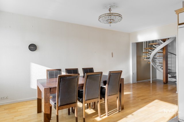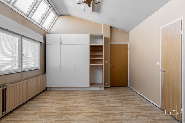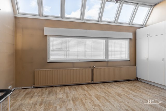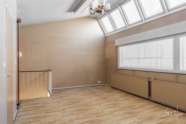 Yläkerrassa on upea, peräti seitsemällä kattoikkunalla varusteltu ja korkean huonekorkeuden omaava huone. Tämä monikäyttöinen tila on valoisa sanan varsinaisessa merkityksessä. Huonetta voi todella käyttää moneen, sen voi jakaa makuuhuoneiksi, käyttää huippuhienona ateljeena tai kirjastona, olohuoneena, minä vain! Yläkerrassa on lisäksi yksi makuuhuone ja asunnon toinen erillinen vessa. Yläkertaan on oma sisäänkäynti.