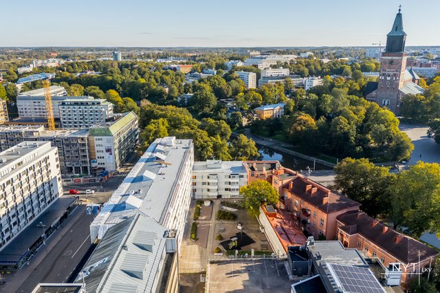 - Keittiö, olohuone ja parveke kakkoon Aurajoen suuntaan. Maisemaa koristaa vehreä miljöö, Tuomiokirkko ja Tähtitorninmäki. Makuuhuoneet ja toinen parveke luoteeseen.