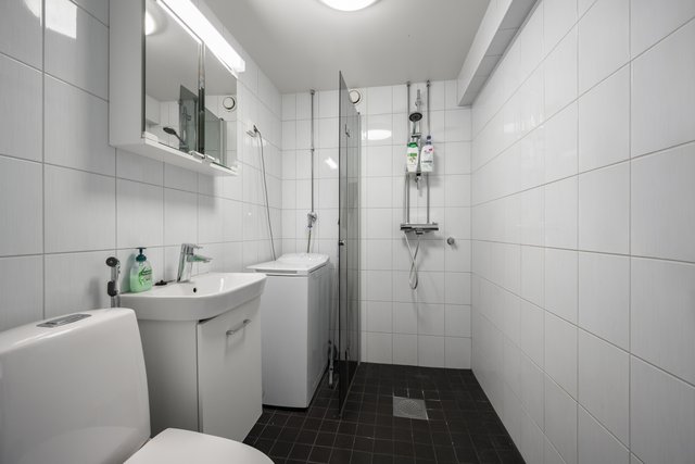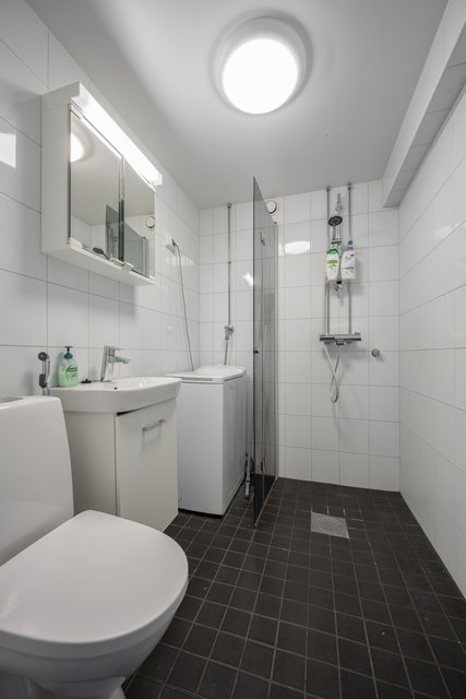 - WC-istuin, suihku, suihkuseinä, pesukoneliitäntä, pesuallas, allaskaappi, bidee-suihku, ja peilikaappi