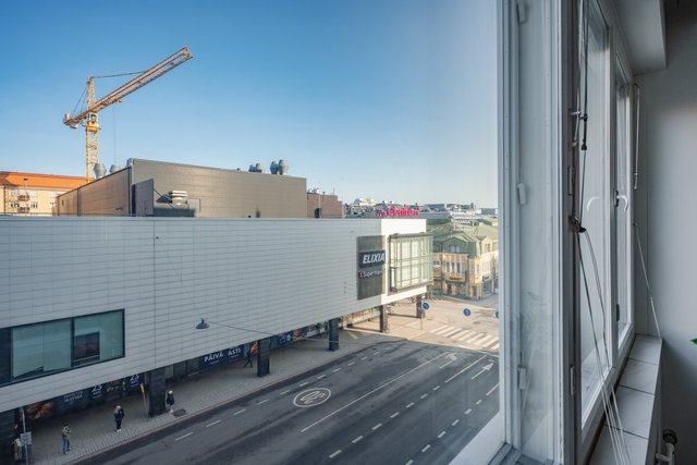 Eerikinkadulla, Turun keskustassa, sijaitsee tämä valoisa ja avara kolmio, joka tarjoaa erinomaiset puitteet kaupunkiasumiseen. Asunto on viidennessä kerroksessa talossa, jossa on hissi, ja sieltä avautuvat näkymät kadulle.