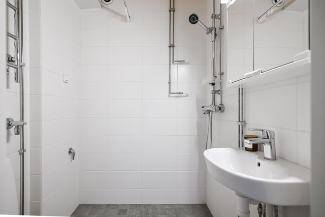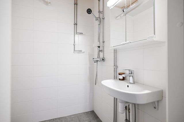 - Kylpyhuoneen varustuksena suihku, wc-istuin, bidee-suihku, peilikaappi, pesukoneliitäntä, pyyhekuivain, lattialämmitys, kiinteät valaisimet. Lattia- ja seinäpinnat laattaa.