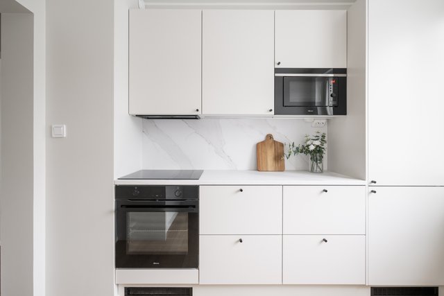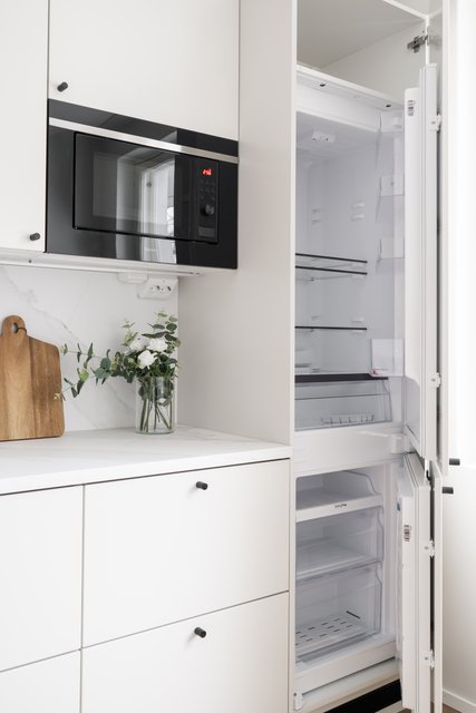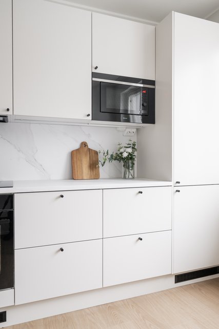 - Keittiön varustuksena integroidut jääkaappipakastin, mikroaaltouuni, induktioliesi, erillisuuni, astianpesukone, kiinteät valaisimet. Lattiapinnat vinyyliä, seinäpinnat maalattu.