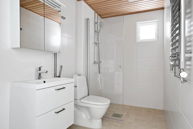 - Kylpyhuoneen varustukseen kuuluu allaskaappi, valaistu peilikaappi, suihku, lasinen suihkuseinä, pyyhekuivain, wc-istuin, bidee-suihku, pyykinpesukoneliitäntä sekä pyyhekoukut. Lattia on laattaa, seinät kaakelia ja katto paneloitu. Ikkuna ulos.
