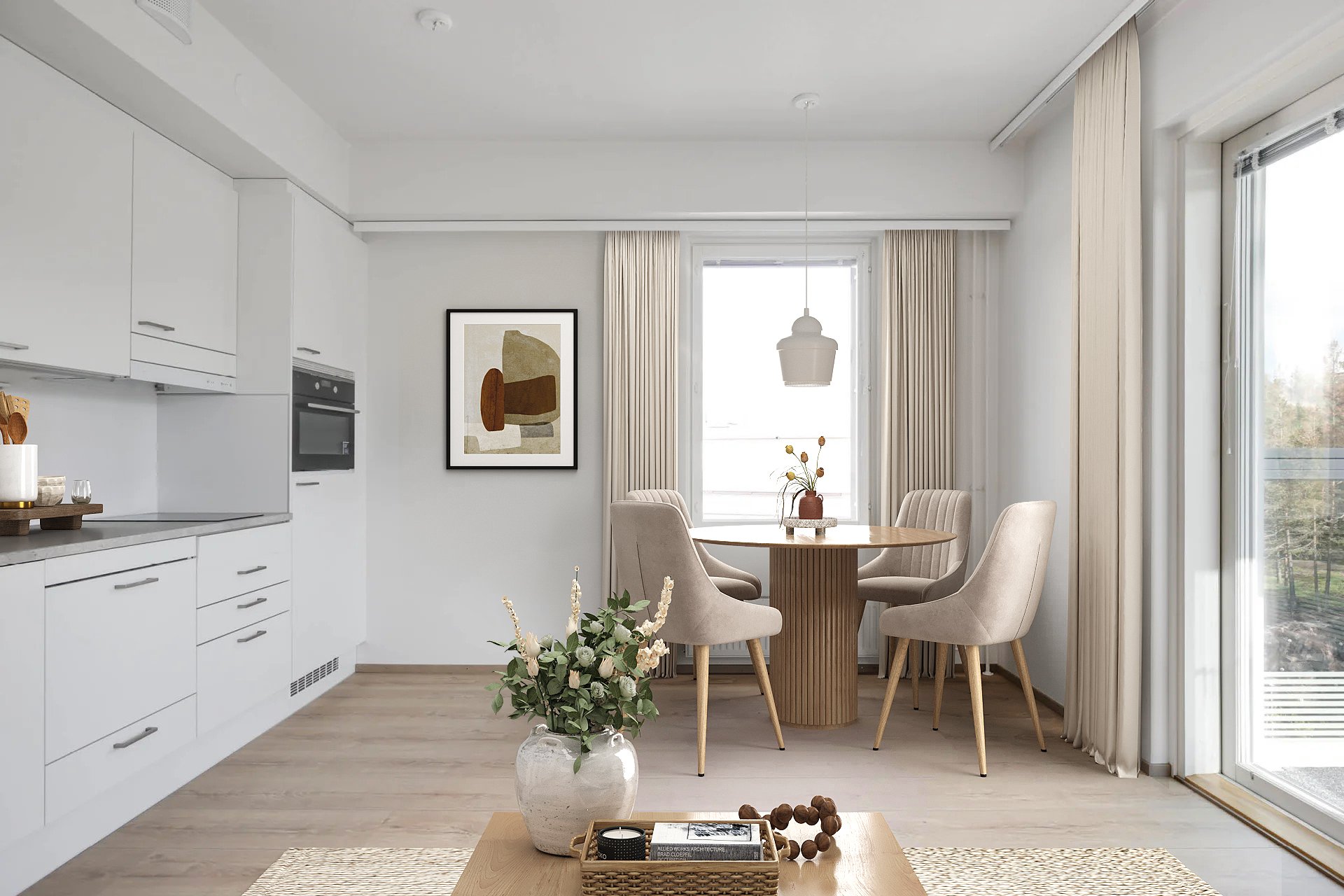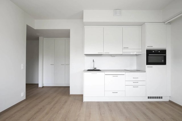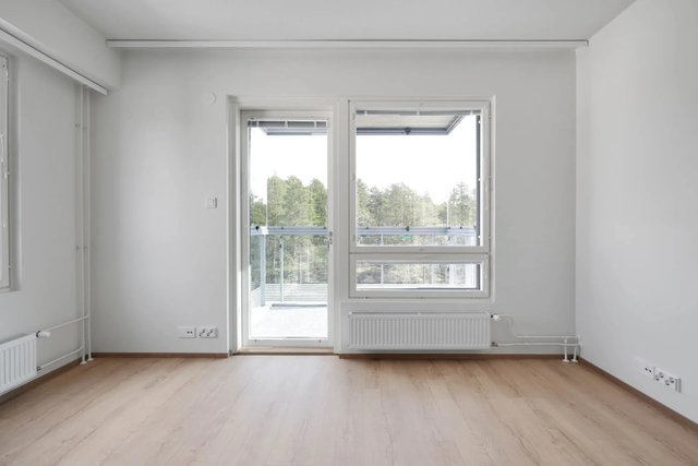 Vaalea avokeittiö on kompakti, mutta erinomaisen toimiva kokonaisuus, jossa laadukkaat kodinkoneet ja toimiva säilytys tekevät ruoanlaitosta sujuvaa. Keittiö avautuu luontevasti olohuoneen yhteyteen, luoden miellyttävät puitteet rentoutumiseen. Lasitettu parveke tuo asumiseen merkittävästi lisätilaa ja kutsuu nauttimaan vehreistä metsänäkymistä aikaisesta keväästä pitkälle syksyyn. Makuuhuoneessa on käytännölliset kiintokaapistot, ja säilytystilaa täydentävät eteisen kaapistot sekä oma huoneistokohtainen kellarikomero. Kylpyhuone on selkeä ja toimiva kokonaisuus, jossa myös pyykkihuollolle löytyy paikkansa.