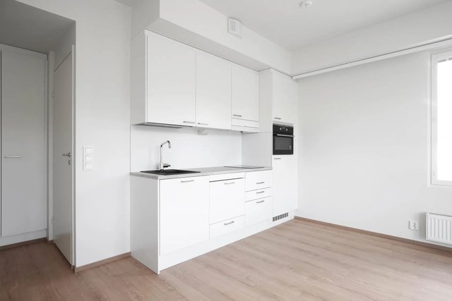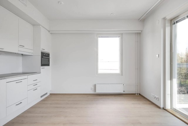 - Avokeittiön varustukseen kuuluu induktioliesitaso, liesituuletin, uuni, jääkaappi-pakastin ja astianpesukone. Lattia on parkettia, seinät maalatut.