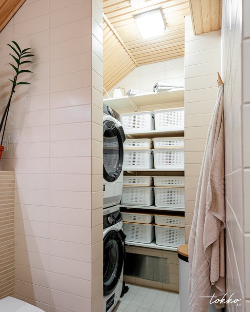 Kylpyhuoneessa on sekä sauna että erillinen WC huoneiston toisen pienen WC:n lisäksi. Kylpyhuoneeseen on myös todella hienosti toteutettu kodinhoitonurkkaus jonne mahtuu vaivatta pyykkitorni ja hyllykkö mm. liinavaatteille.