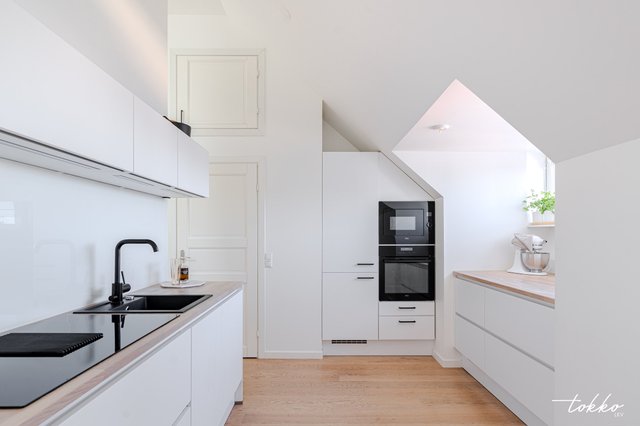 - Upea Noblesssan v. 2019 uusittu valkoinen keittiö jossa tammiset puutasot.