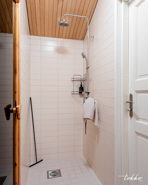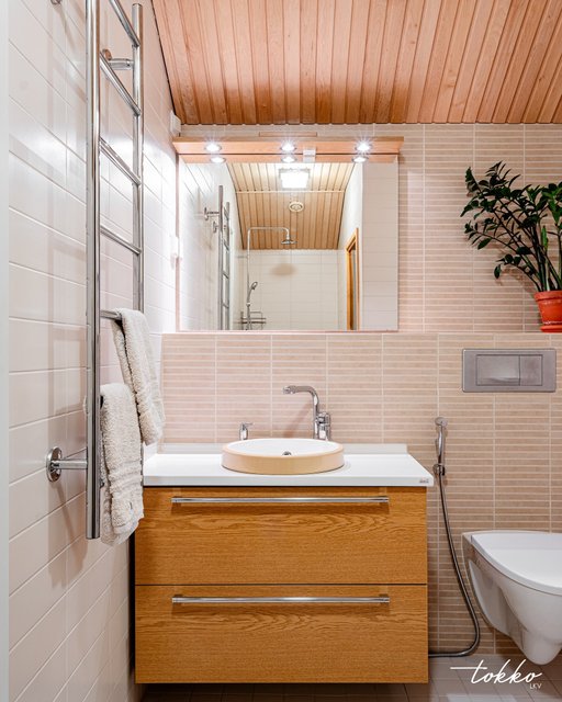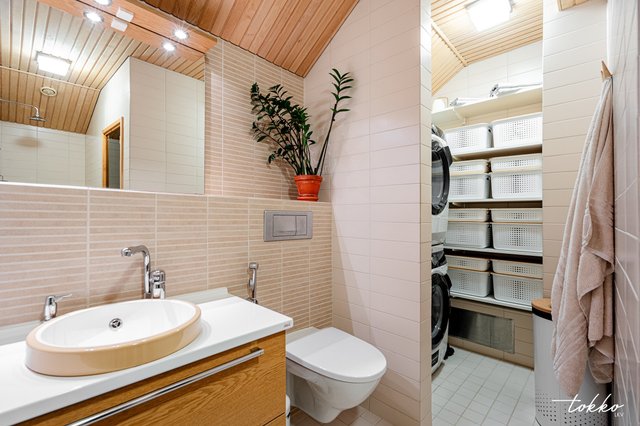 - Avara kylpyhuone jossa oma sauna ja kodinhoitonurkkaus. Kylpyhuoneesta löytyy myös WC. Värimaailma on vaalean beige.