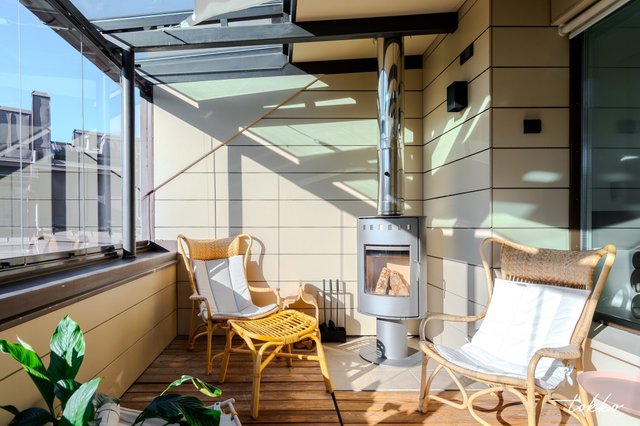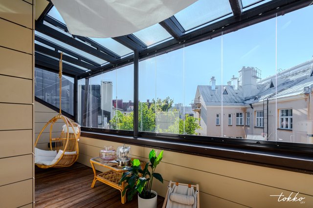 Asunnon ehdoton helmi on etelään suuntautuva lasitettu kattoterassi, joka toimii lisähuoneena keväästä pitkälle syksyyn ja miksei vaikka koko vuoden ympäri, sillä takan ansiosta terassilla voi viettää iltaa tunnelmallisesti myös viileämpinä kuukausina.