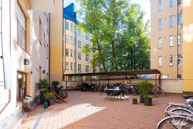 - Keskeinen sijainti Taka-Töölössä. Vierestä löytyvät kulttuuritehdas Korjaamo, Töölön kisahalli sekä oopperatalo ja Olympia-stadion. Lähellä on myös keskuspuisto, Helsingin jäähalli ja lukuisia ravintoloita sekä muita palveluita. Kulkuyhteydet ovat läheisen Mannerheimintie ansiosta erinomaiset ja autolla pääsee niin ikään liikkumaan kätevästi.