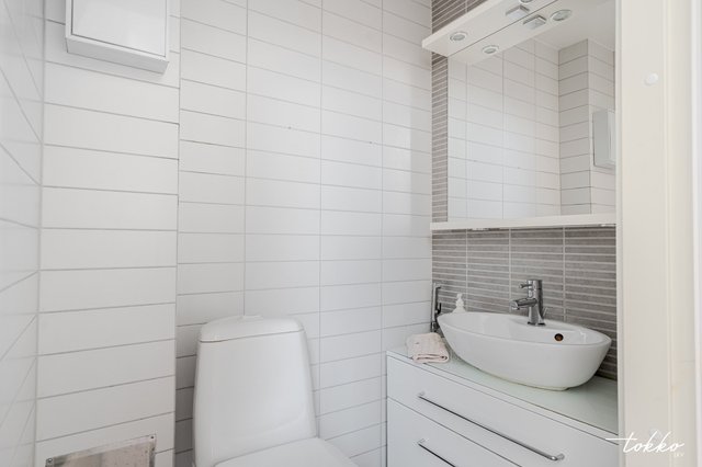 - WC-istuin, suihku, pesukoneliitäntä, lattialämmitys, peilikaappi, pesuallas, ja bidee-suihku