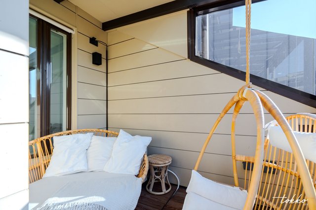 - Valoa tulviva olohuone jossa huikea kattokorkeus. Osittainen avokeittiö yhdistyy ruokailutilaan ja olohuoneeseen, sekä olohuoneen jatkona toimiva iso lasitettu terassi kruunaa kokonaisuuden.