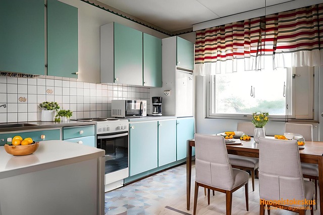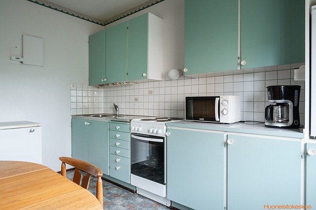 - apk-liitin on, erillinen pakastin ei sisälly kauppaan. Keittiön seinät osin paneloitu, osin tapettia. Välitilan seinä laatoitettu, keittiön kaapistot maalattu n. 90-luvulla.