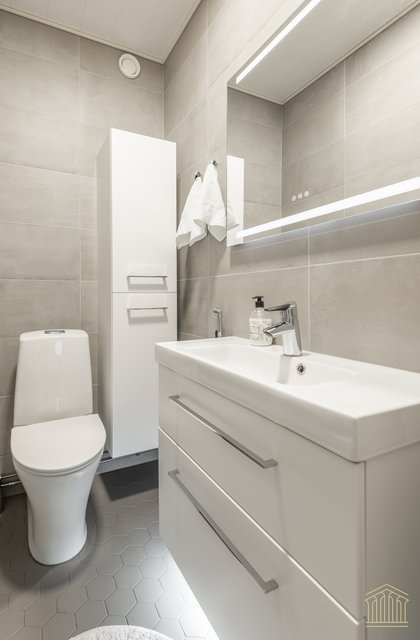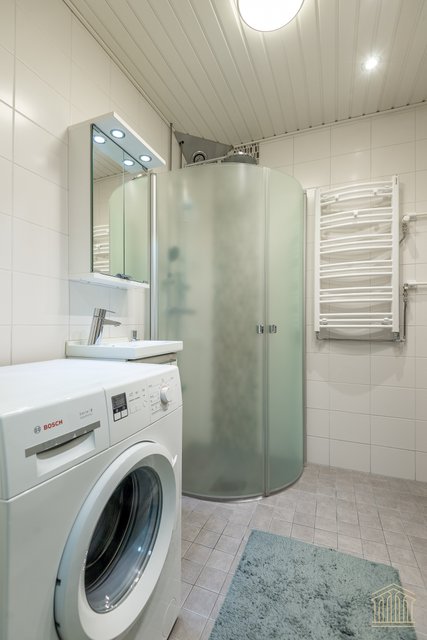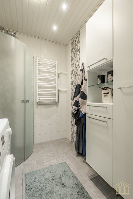 - Suihku (sadesuihku), suihkuseinä, pesukoneliitäntä, peilikaappi, pesuallas, allaskaappi, ja kaapisto, rättipatteri