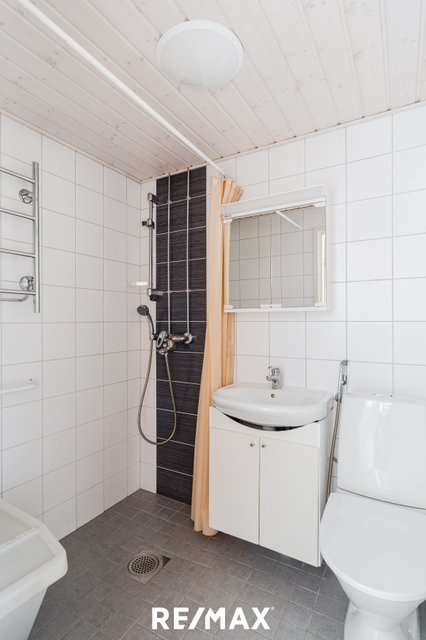 - WC-istuin, suihku, pesukoneliitäntä, peilikaappi, pesuallas, allaskaappi, bidee-suihku, ja pyyhekuivain