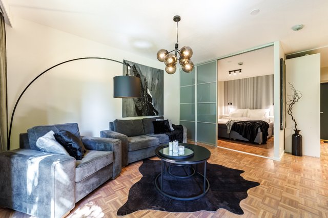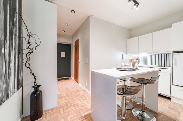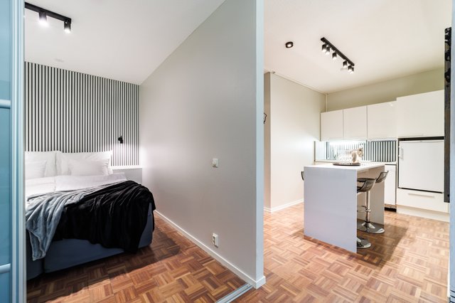 Kaksio sijaitsee talon ensimmäisessä kerroksessa, ja sen tilaratkaisut on suunniteltu käytännöllisiksi. Olohuoneen ja keittiön parkettilattiat tuovat sisustukseen lämpöä ja viihtyisyyttä. Virallisen makuuhuoneen lisäksi asunnossa on rakennettu toinen makuu-alkovi, mikä mahdollistaa jopa kuuden hengen majoittumisen mukavasti. Kylpyhuoneessa on lattialämmitys, joka lisää arjen mukavuutta ja tuo ripauksen luksusta.+358400878969