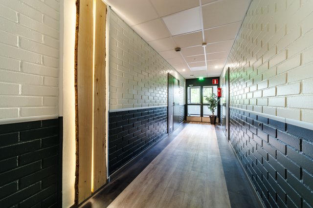 poistumistie opasteet uusittiin, käytävien alakatot uusittiin, käytävien lattiamateriaalit uusittiin ja