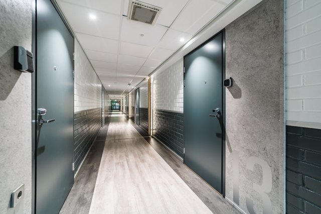Porraskäytävä ja huonekäytävien perussaneeraus, jossa uusittiin kaikki huoneisto-ovet, valistus ja