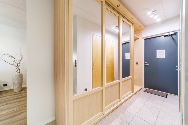 Porraskäytävä ja huonekäytävien perussaneeraus, jossa uusittiin kaikki huoneisto-ovet, valistus ja