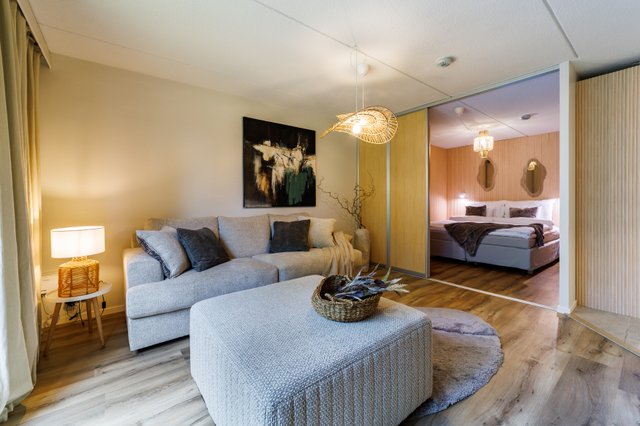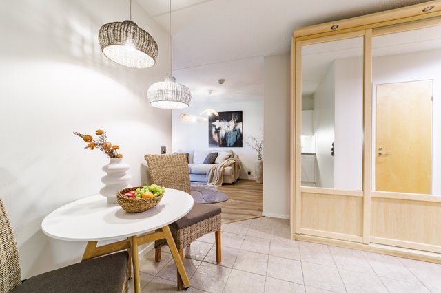 Kaksio sijaitsee talon toisessa kerroksessa, ja sen tilaratkaisut on suunniteltu käytännöllisiksi. Virallisen makuuhuoneen lisäksi asunnossa on rakennettu toinen makuu-alkovi, mikä mahdollistaa jopa kuuden hengen majoittumisen mukavasti. Kylpyhuoneessa on lattialämmitys, joka lisää arjen mukavuutta ja tuo ripauksen luksusta.