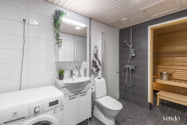 - WC-istuin, suihku, suihkuseinä, pesukoneliitäntä, allaskaappi, pesuallas, peilikaappi, ja bidee-suihku