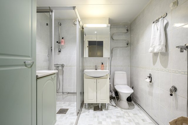 - Kylpyhuone myös on yksiöille poikkeuksellisen tilava. Kokonaan laatoitetussa kylpyhuoneessa on jopa oikein hyvät kaapistotilat ja hieman laskutilaakin esim. vaatehuoltoon. Varusteina on: liukuovellinen suihkunurkkaus, peilikaappi, käsienpesuallas ja allaskaappi, allashana ja bideesuihku, wc-istuin, seinämallinen pyyhekuivain, pesukoneliitäntä, yksi täysikorkea ja yksi matalampi kaappi.