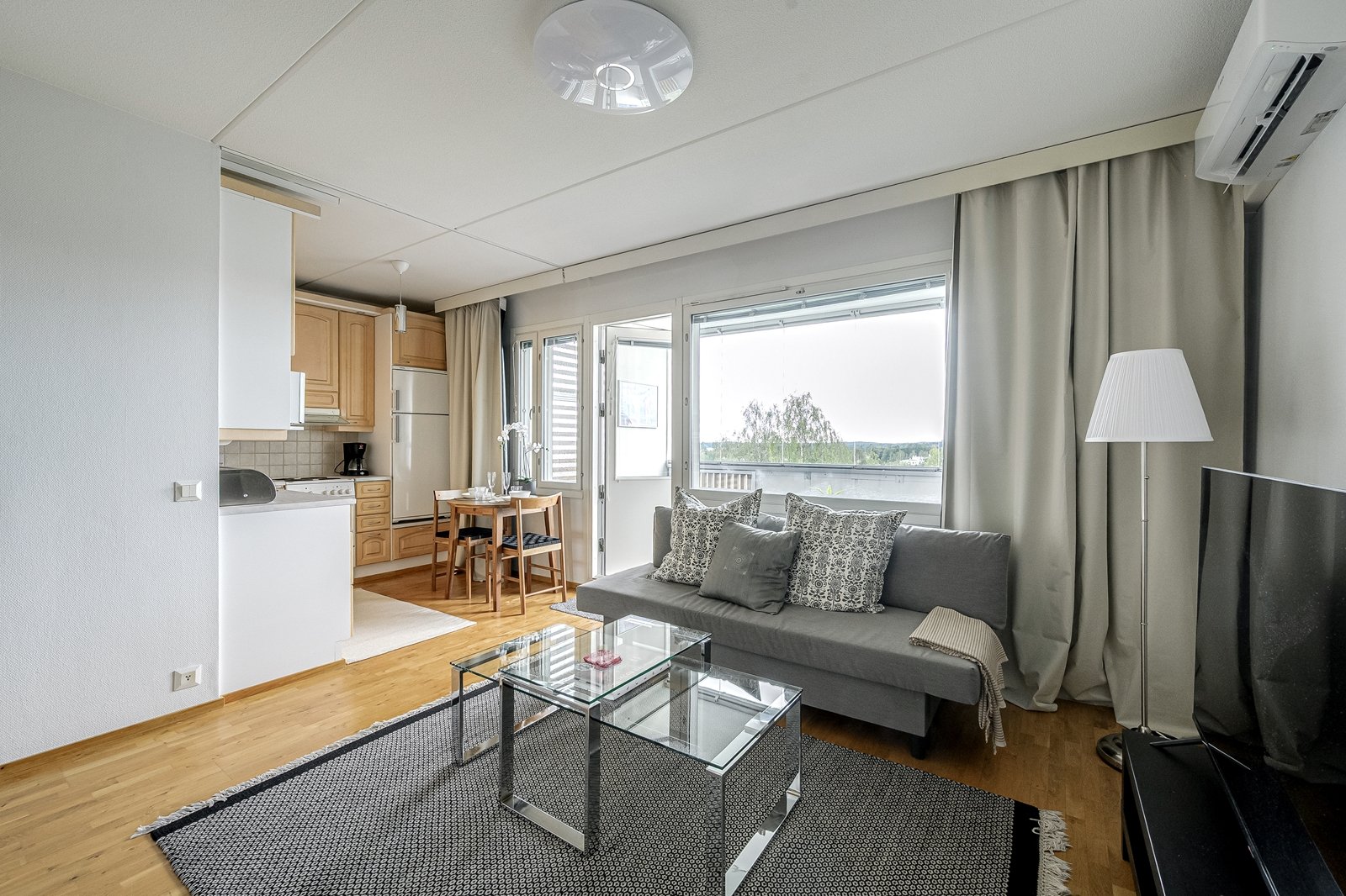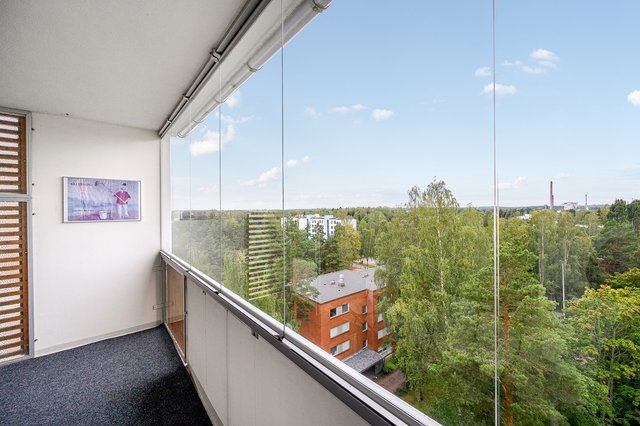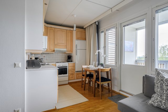 Uusia asukkaita odottaa hissitalon 8/8 kerroksen huoneisto, jonka todellista kokoa ei ole uskoa todeksi. Hyvällä suunnittelulla huoneiston 35 neliössä on saatu tuntumaan lähes kaksiolta, jossa on täysikokoinen keittiö sekä kylpyhuone ja loistava alkovisyvennys makuuhuoneeksi. Viihtyisää lisätilaa löytyy vuoden ympäri lasitetulta parvekkeelta. Tilasuunnittelu on niin onnistunut, että huoneisto sopii hyvin myös pariskunnalle.