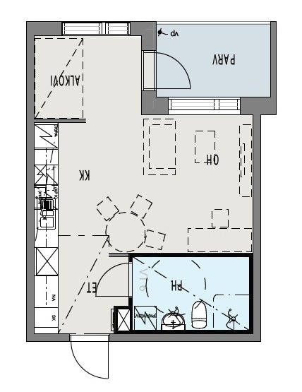 - Suihku, wc-istuin, lattialämmitys, peilikaappi, ja pesukoneliitäntä