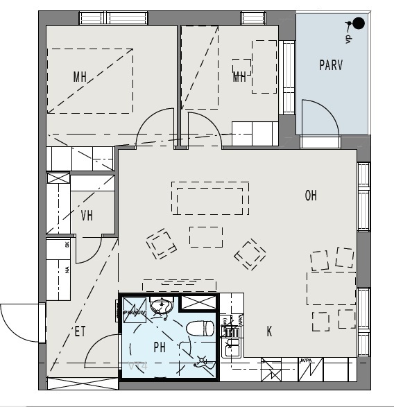 Avaraa olohuone/keittiötilaa, reilun kokoinen kylpyhuone, kaksi makuuhuonetta sekä vaatehuone.