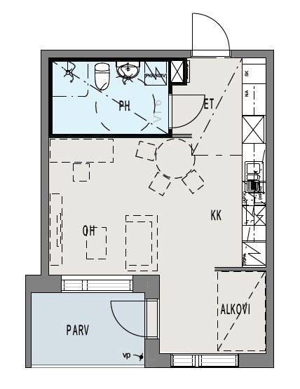 Huoneistossa keittiö ja olohuone yhdistyvät harmonisesti, luoden avaran ja viihtyisän tilan. Erillinen makuualkovi tuo yksityisyyttä ja selkeyttä asumiseen. Tilava, laatoitettu kylpyhuone.