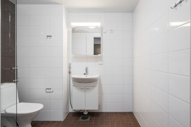 - WC-istuin, suihku, suihkuseinä, pesukoneliitäntä, peilikaappi, allaskaappi, bidee-suihku, ja lattialämmitys