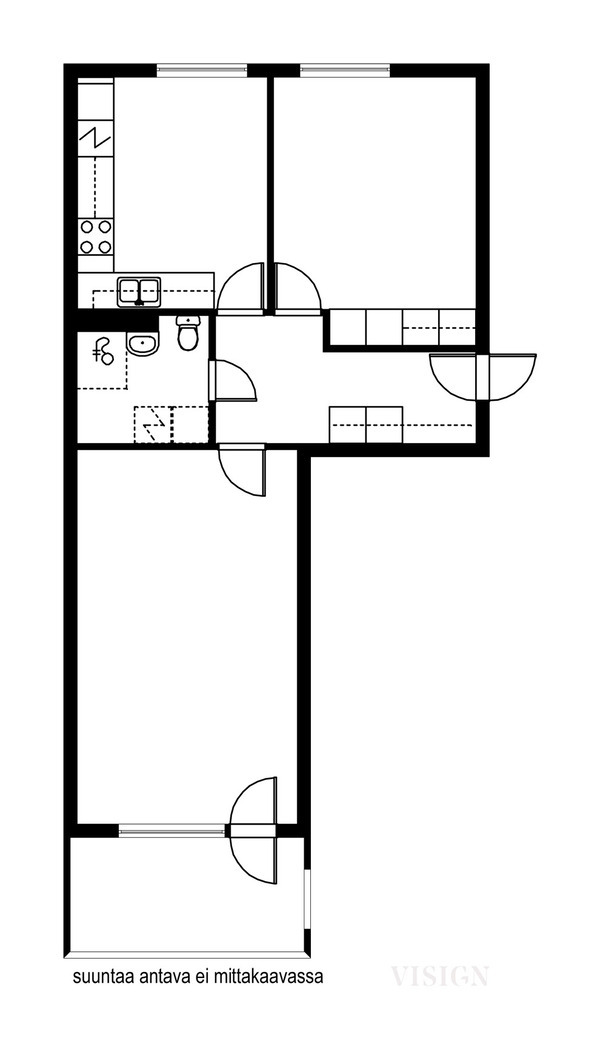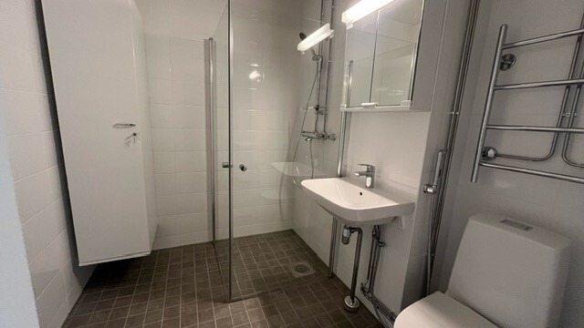 - WC-istuin, lattialämmitys, allaskaappi, peilikaappi, suihkuseinä, pesukoneliitäntä, ja suihku