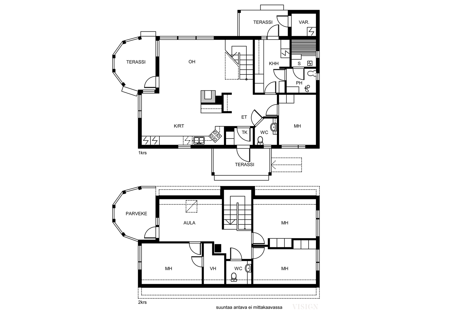 1 krs: oloh., k, mh, khh, ph,s, wc, ter., yläkerta: 3 mh, aula, vh, wc, p