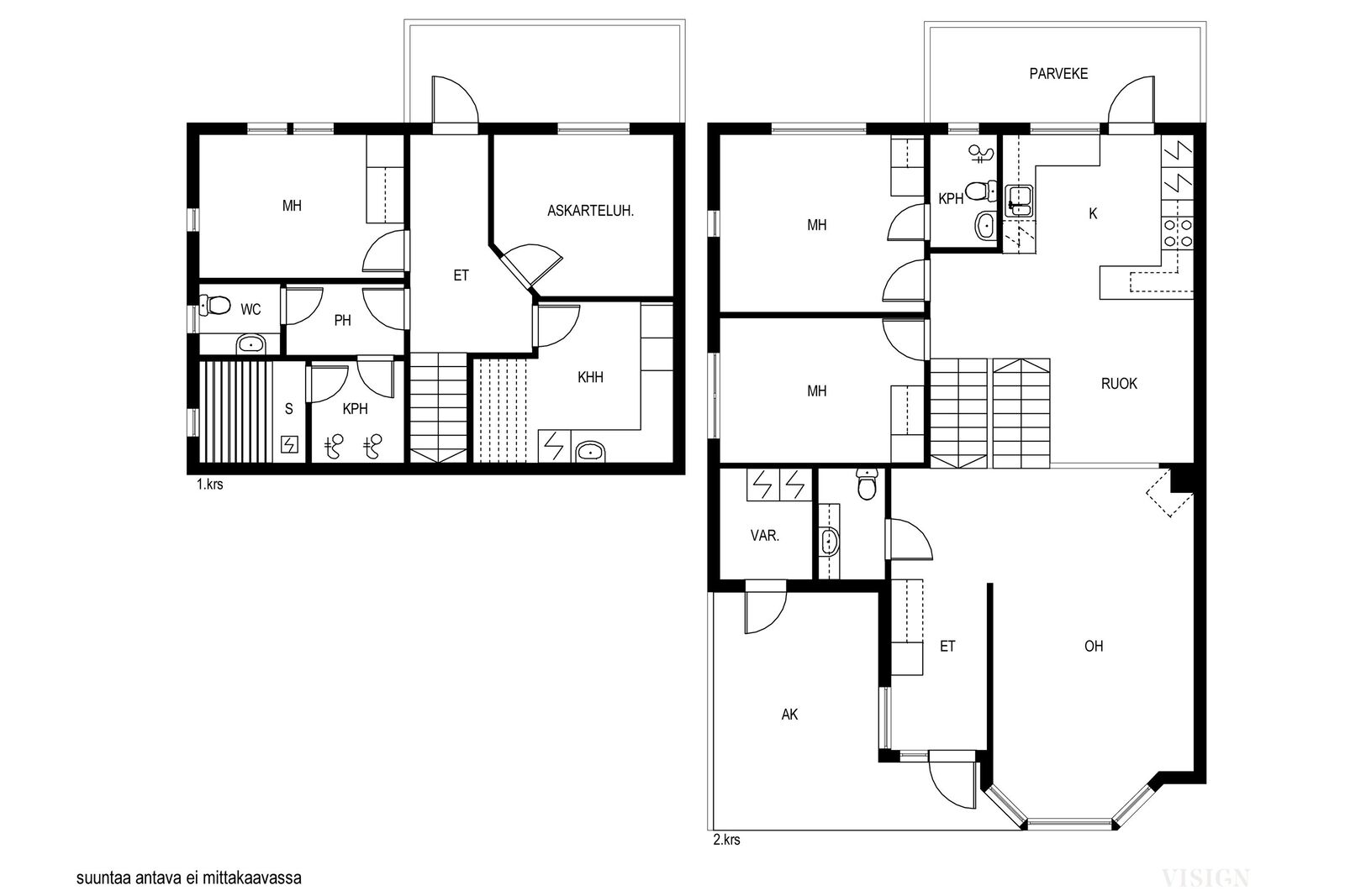- Näkymät keittiöstä, kahdesta makuuhuoneesta, askarteluhuoneesta, yläkerran WC:stä, parvekkeelta ja terassilta idän suuntaan lähimetsään päin. Näkymät olohuoneesta ja eteisestä lännen suuntaan lähipuistoon päin. Näkymät kaikista makuuhuoneista, saunasta ja alakerran WC:stä pohjoisen suuntaan sisäpihalle päin.