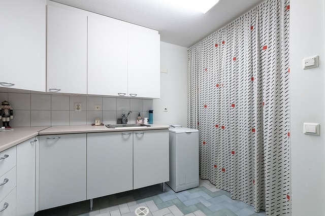 - Pöytätaso, pesuallas, pyykkikaapit, pesukoneliitäntä, lattiakaivo, ja lattialämmitys