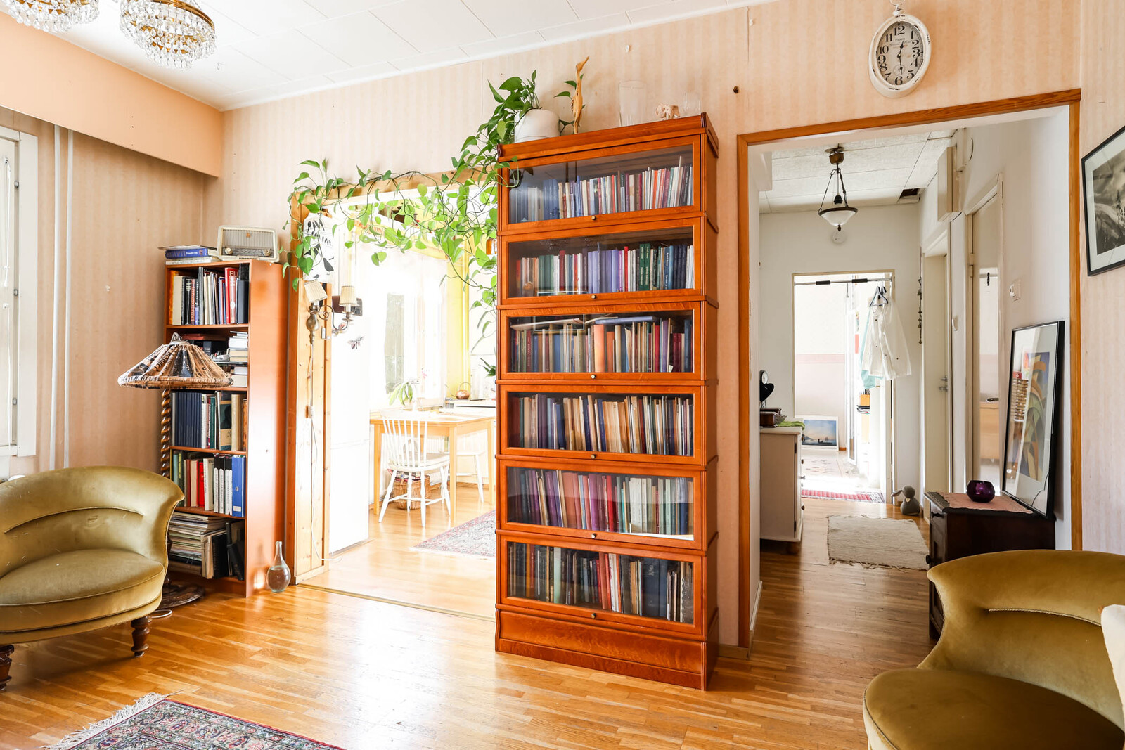 Ensimmäisen kerroksen 44 m²:n kaksio sijaitsee 1930-luvun puutaloyhtiössä, aivan puiston kupeessa. Pohjaratkaisu on selkeä: olohuone, erillinen keittiö, tilava kammari ja kylpyhuone. Asunnossa on nykyaikaisia mukavuuksia, mutta ei liian siloteltua: Keittiössä on varaus astianpesukoneelle. Kylpyhuone on uusittu LVIS-remontin yhteydessä ja varustettu lattialämmityksellä.