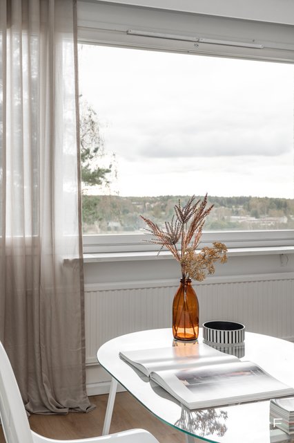 Läpitalon sijainti tuo asuntoon runsaasti luonnonvaloa eri ilmansuunnista ja luo avaran, viihtyisän tunnelman.