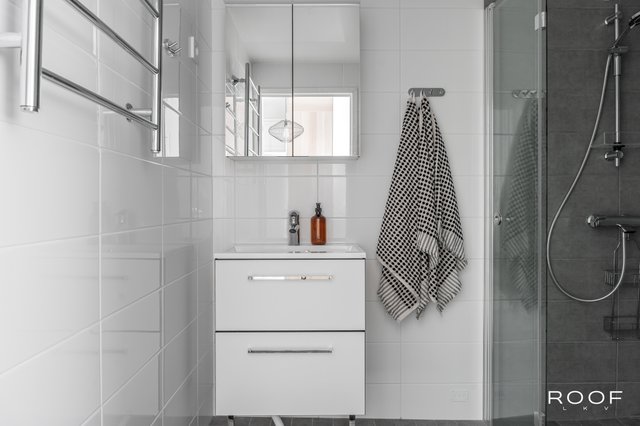 - Suihku, suihkuseinä, pesukoneliitäntä, allaskaappi, peilikaappi, ja pyyhekuivain