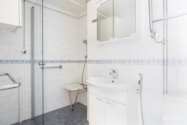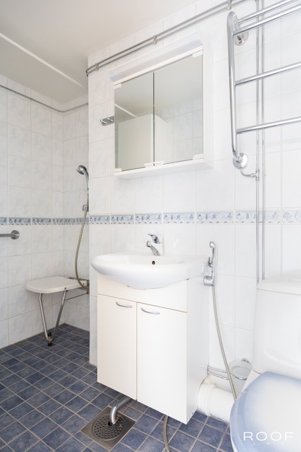 - VARUSTUS: Suihku, WC-istuin, Bidee, Hana, Peili, Allas, Allaskaapisto, Seinäkaappi, Seniorikahvat, Taitet. seniori-tuoli, Pesukoneliitäntä, Lattialämmitys. SEINÄT:Kaakeli. LATTIA: Kaakeli.