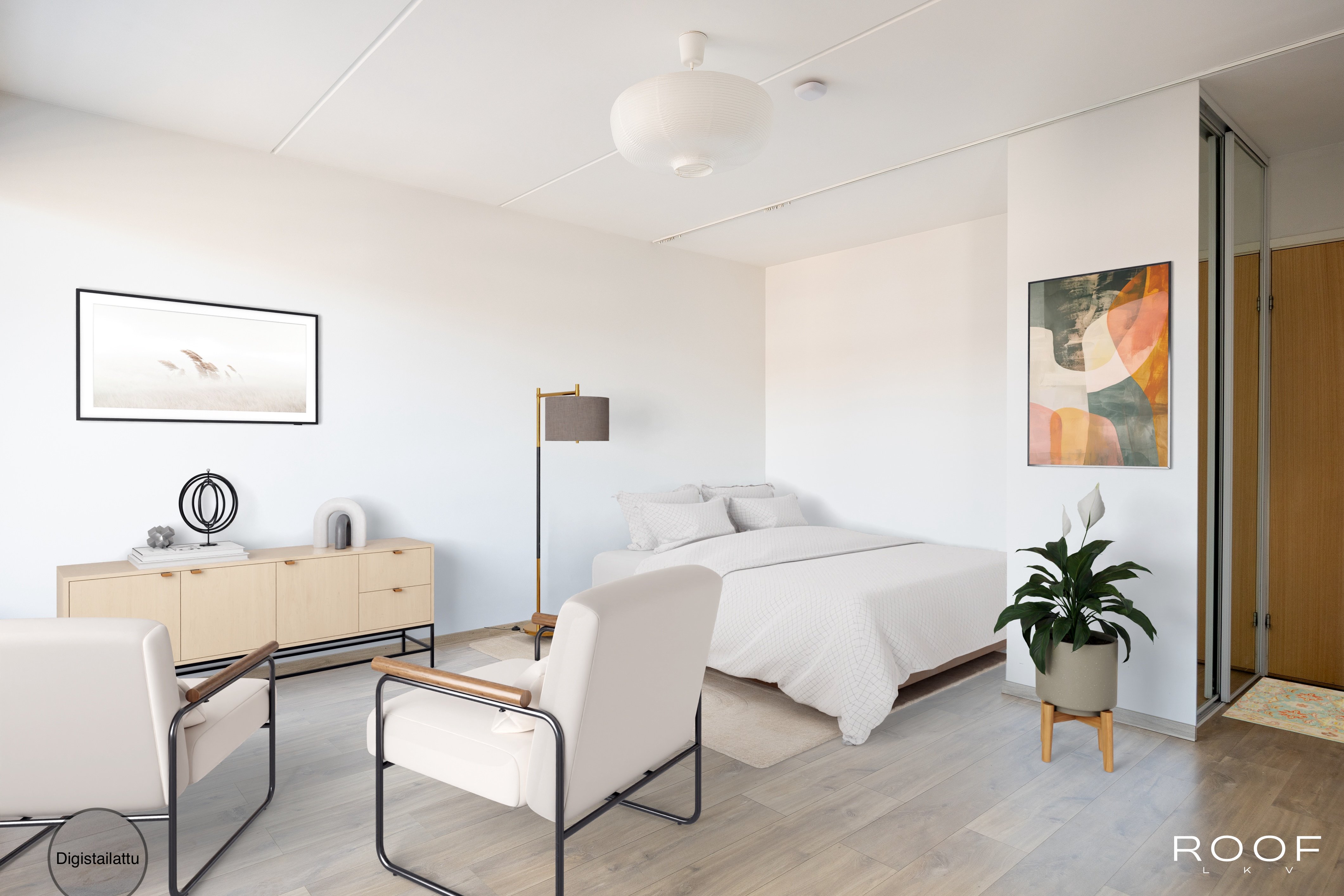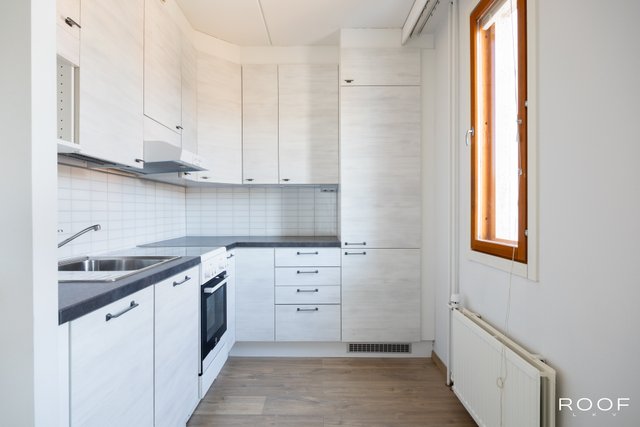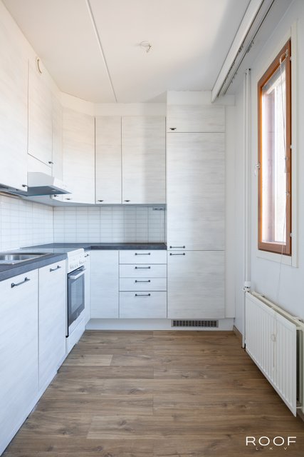 Tyylikkäästi remontoitu keittiö ja uudet kodinkoneet tekevät arjesta vaivatonta. Vaaleat pinnat ja suuret ikkunat tuovat luonnonvaloa ja tilantuntua, ja käytännöllinen alkovi lisää asumismukavuutta.