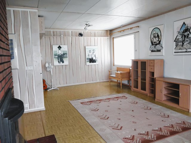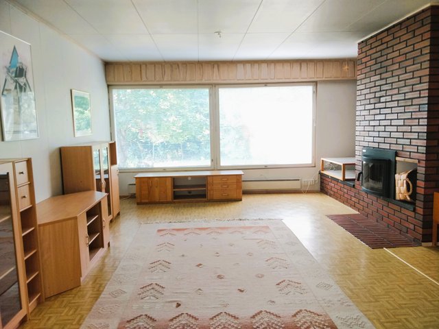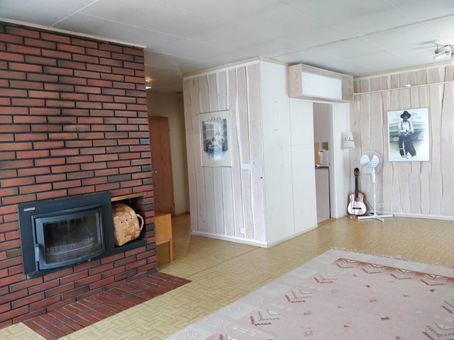 - Tilava olohuone, jossa takka. Takka on alkujaan ollut avotakka, johon on myöhemmin asennettu takkasydän.