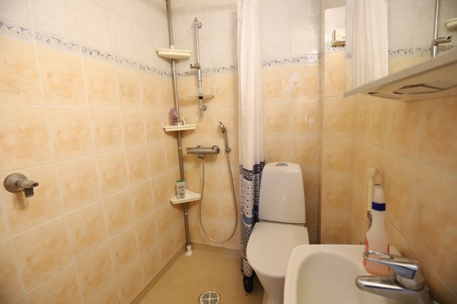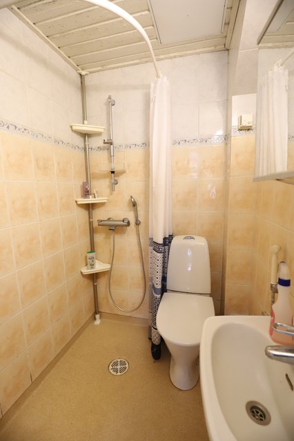 - WC-istuin, suihku, pesuallas, peilikaappi, ja pesukoneliitäntä