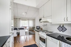 - jääkaappi/pakastin (Rosenlew), kaapistot, liesi (sähkö, Electrolux v.2023), liesituuletin (Rosenlew), astianpesukone (40cm, Rosenlew), lattia (laminaatti), seinät (maali). Keittiö uusittu 2003.