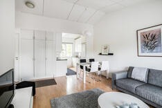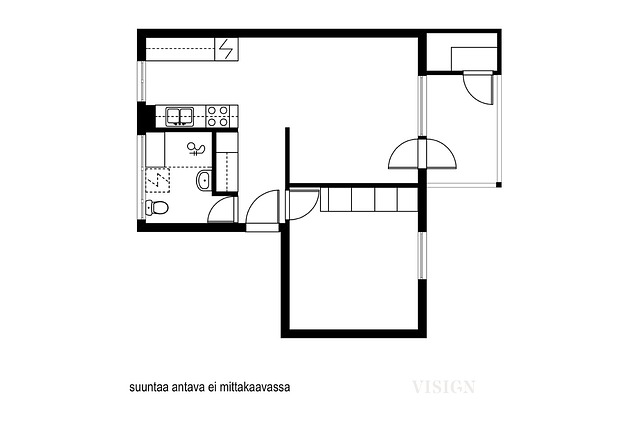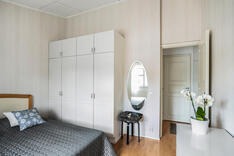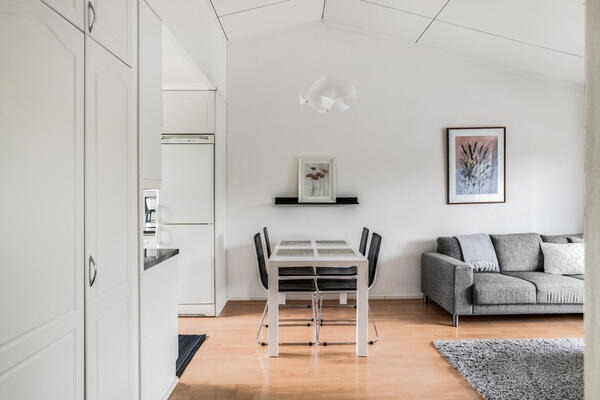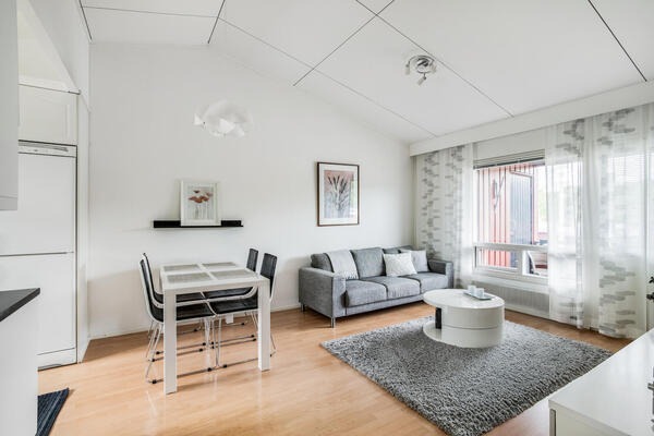 Kaunis ja harmoninen 44m2 kaksio. Olohuoneessa ja makuuhuoneessa on korkea viistokatto, joka tekee asunnosta neliöitään tilavamman tuntuisen.