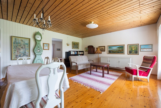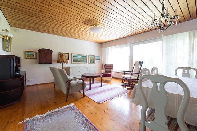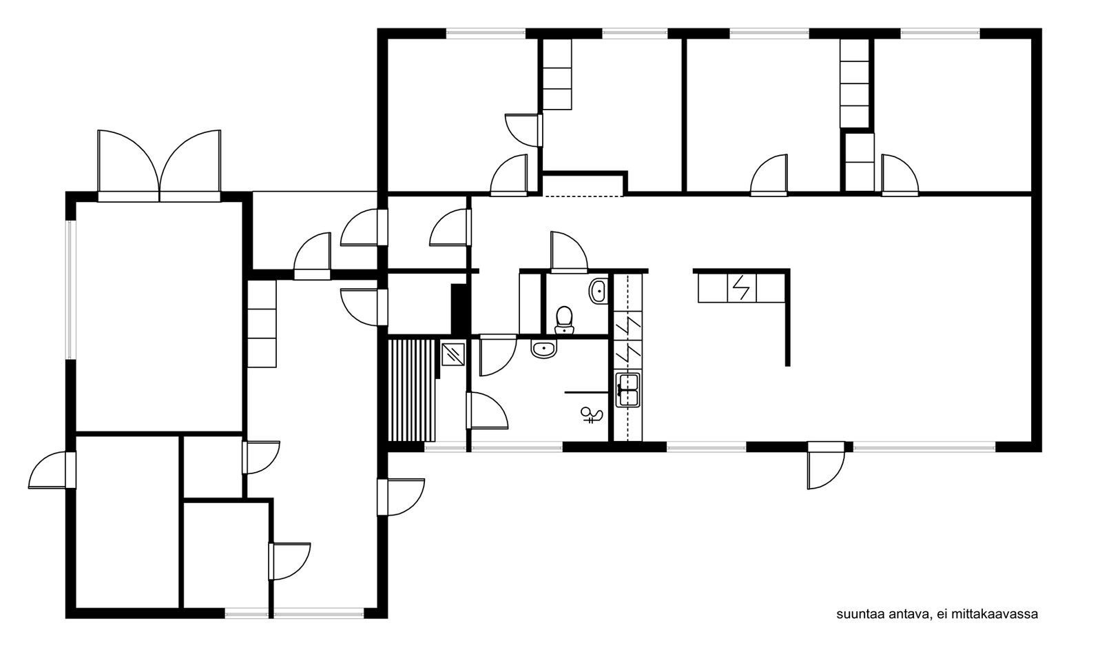 - Keittiö ja olohuone puu, makuuhuoneet maalattu, pesuhuone ja sauna paneli, wc maalattu