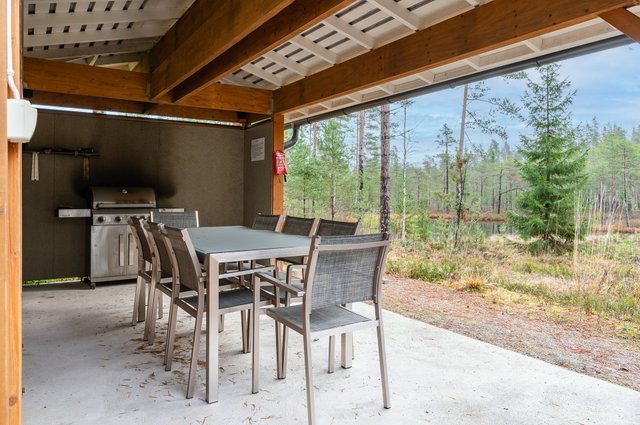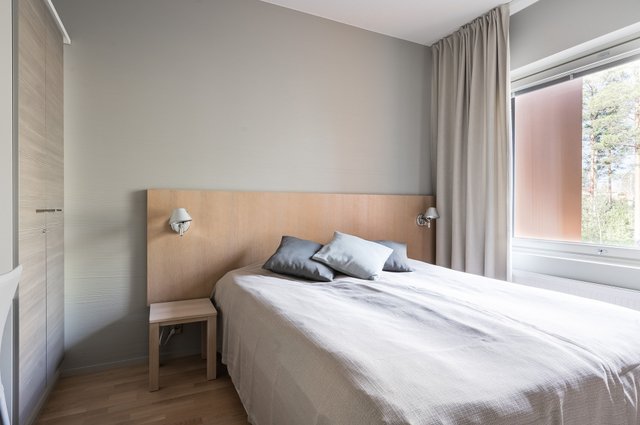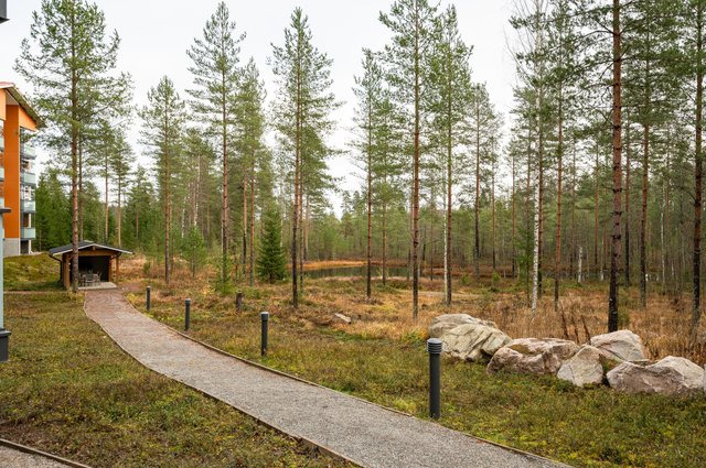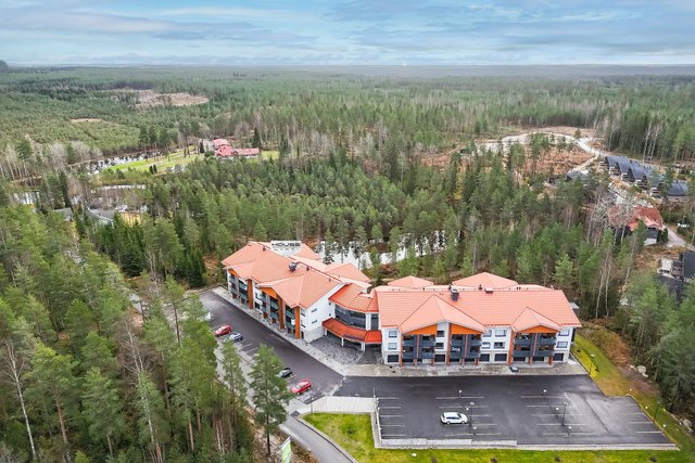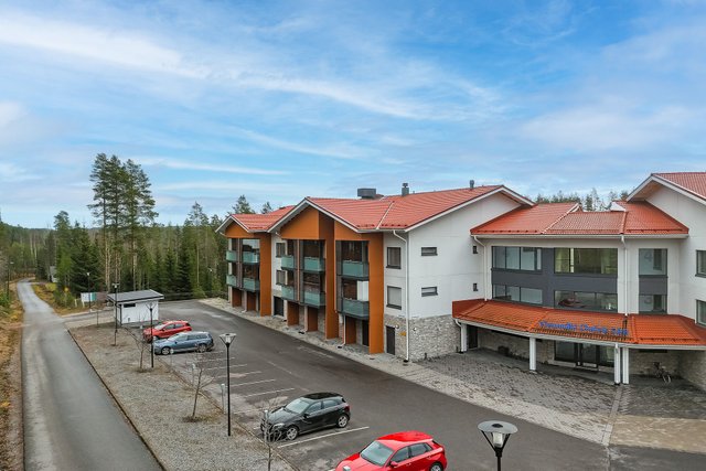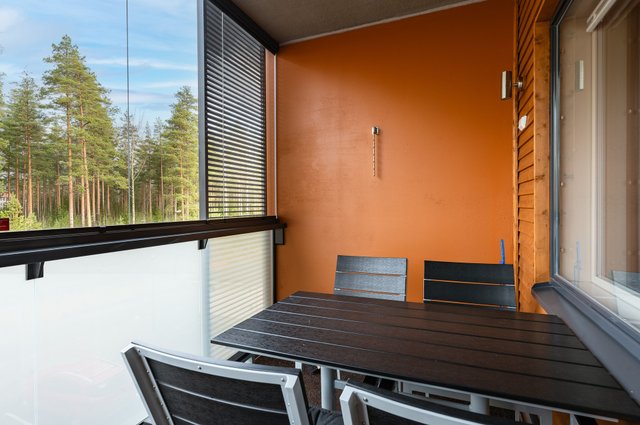 Huoneisto sijaitsee ylimmässä kerroksessa, ja sieltä avautuu kaunis näkymä kangasmetsään kylpylähotellille päin. Lasitetulla parvekkeella voi nauttia rauhallisista aamuista ja iltahetkistä. Asunnossa on tilava olohuone avokeittiöllä, makuuhuone sekä lisämakuualkovi, joka tarjoaa majoitustilaa jopa 3 hengelle. Olohuoneen levitettävä sohva nostaa majoituskapasiteetin jopa 7 henkeen. Sauna ja moderni kylpyhuone lattialämmityksellä pesukoneineen ja kuivauskaappeineen tuovat lisämukavuutta aktiiviseen lomailuun.