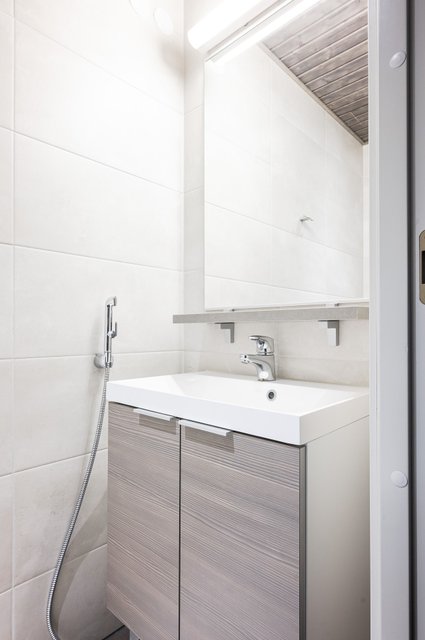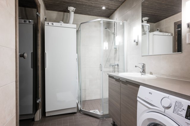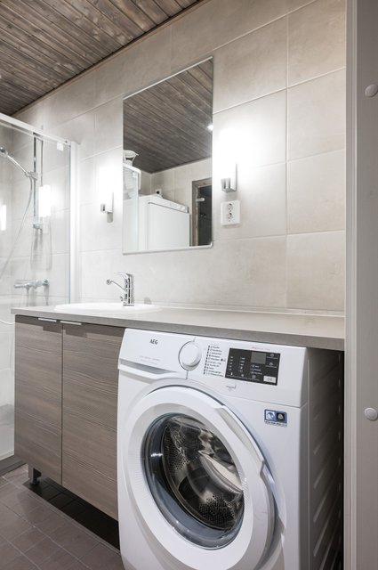 - Suihkuseinä, lattialämmitys, suihku, peili, pesukoneliitäntä, pesuallas, allaskaappi, kuivauskaappi, ja pesukone