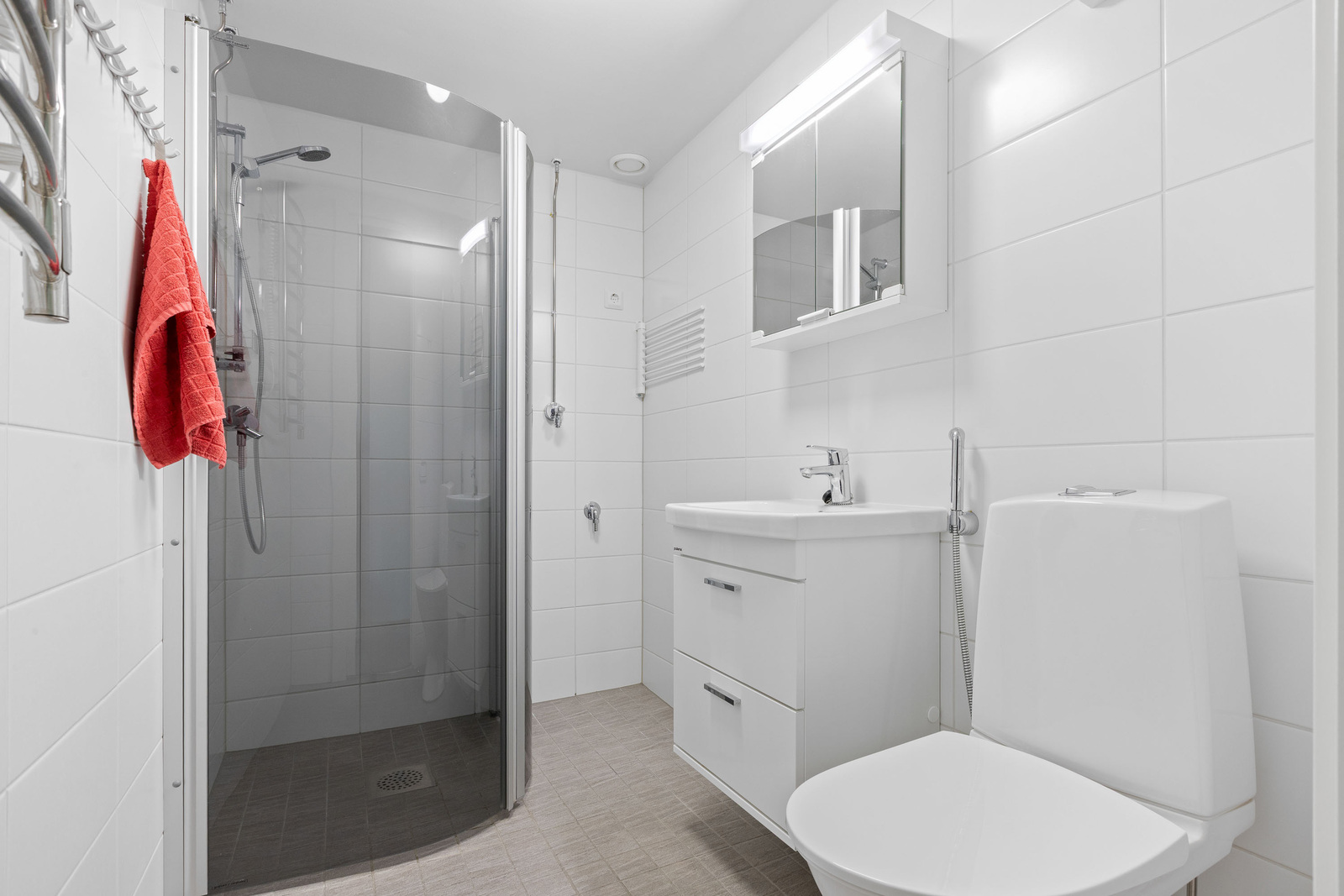 - Peilikaappi, suihkuseinä, allaskaappi, suihku, pesukoneliitäntä, lattialämmitys, wc-istuin, ja kiinteät valaisimet, asennettuja erikoisvarusteita